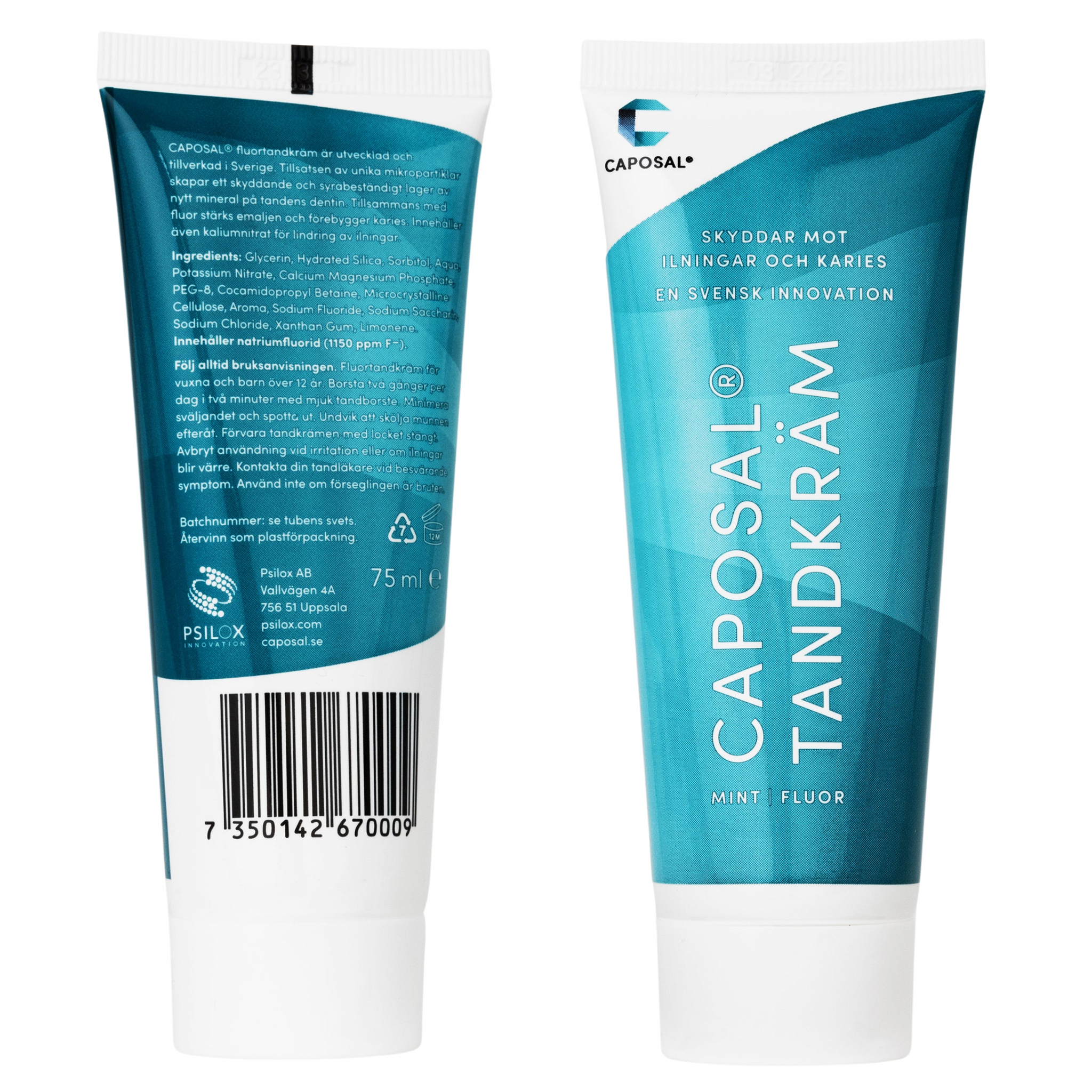 CAPOSAL® Tandkräm är utvecklad och tillverkad i Sverige. Tillsatsen av unika mikropartiklar skapar ett skyddande och syrabeständigt lager av nytt mineral på tandens emalj och dentin. Tillsammans med fluor stärks emaljen och förebygger karies. Tandkrämen innehåller även kaliumnitrat för lindring av ilningar.